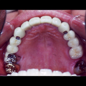 60代 男性 下顎左右の奥歯に5本のインプラントを埋入し、上下顎全歯牙をメタルボンドセラミッククラウン(白い歯)にて審美修復を実施。